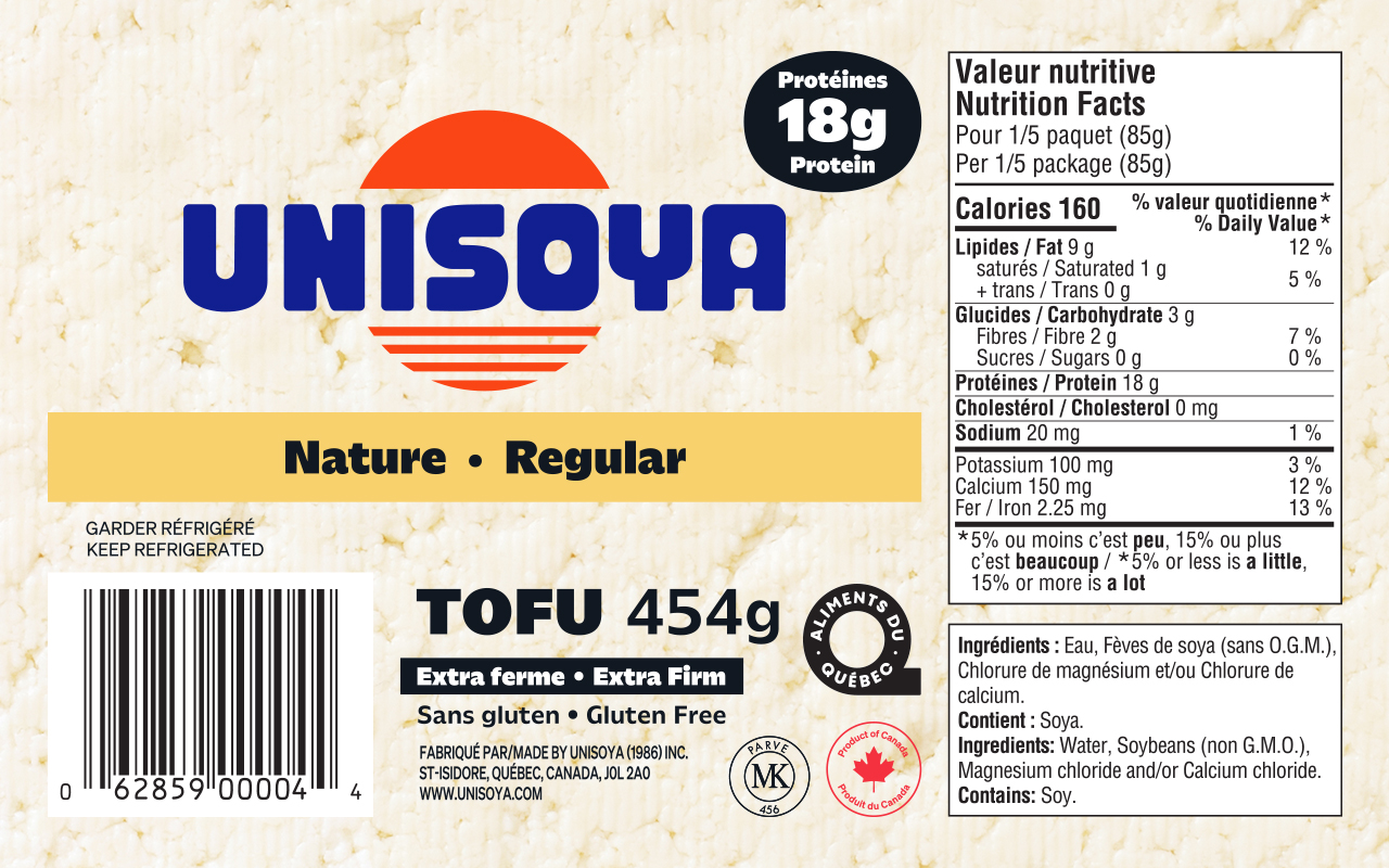 Voici le tofu nature que vous pouvez trouver dans votre épicerie et magasins d’aliments naturels. Tous nos produits sont pasteurisés.